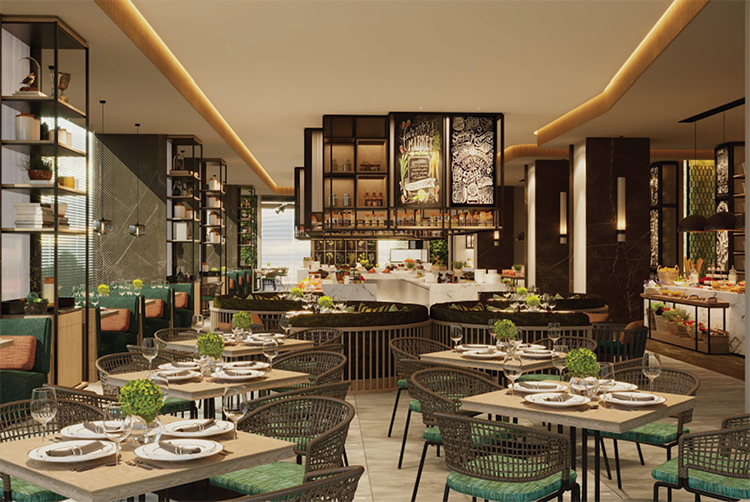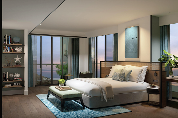 Điểm nhấn của mỗi phòng khách sạn là những ô cửa kính trong suốt kéo dài từ sàn lên sát trần nhà và ban công thoáng rộng, giúp không gian và tầm nhìn được mở rộng tối đa, như thu trọn cả đại dương mênh mông về trước cửa. Sự kết hợp hài hoà giữa phong cách hiện đại và dấu ấn phương Đông đậm nét là tinh thần chủ đạo xuyên suốt trong thiết kế nội thất khách sạn. Những chất liệu tự nhiên như gỗ, mây tre…được nhấn nhá trong từng chi tiết, pha trộn trong các gam màu đồng, vàng, nâu ấm áp và trắng – xanh lá, xanh dương mát dịu, gợi nhắc đến nắng vàng biển xanh của một thiên đường biển đảo ngập tràn nắng gió.