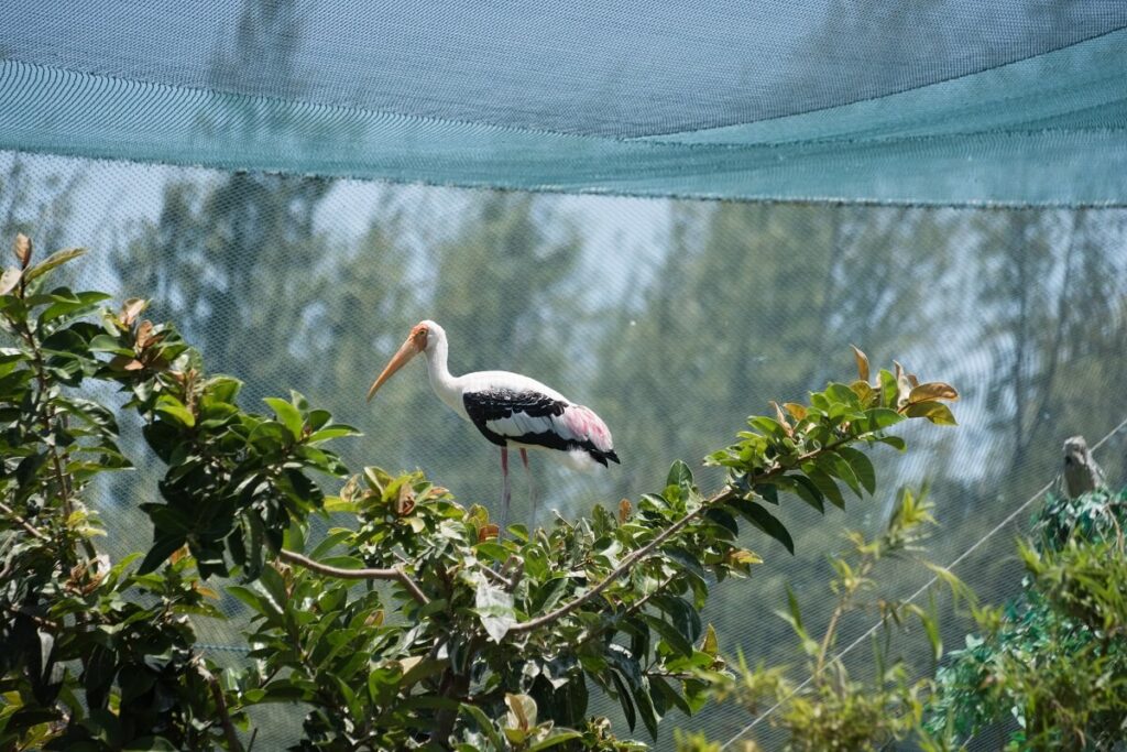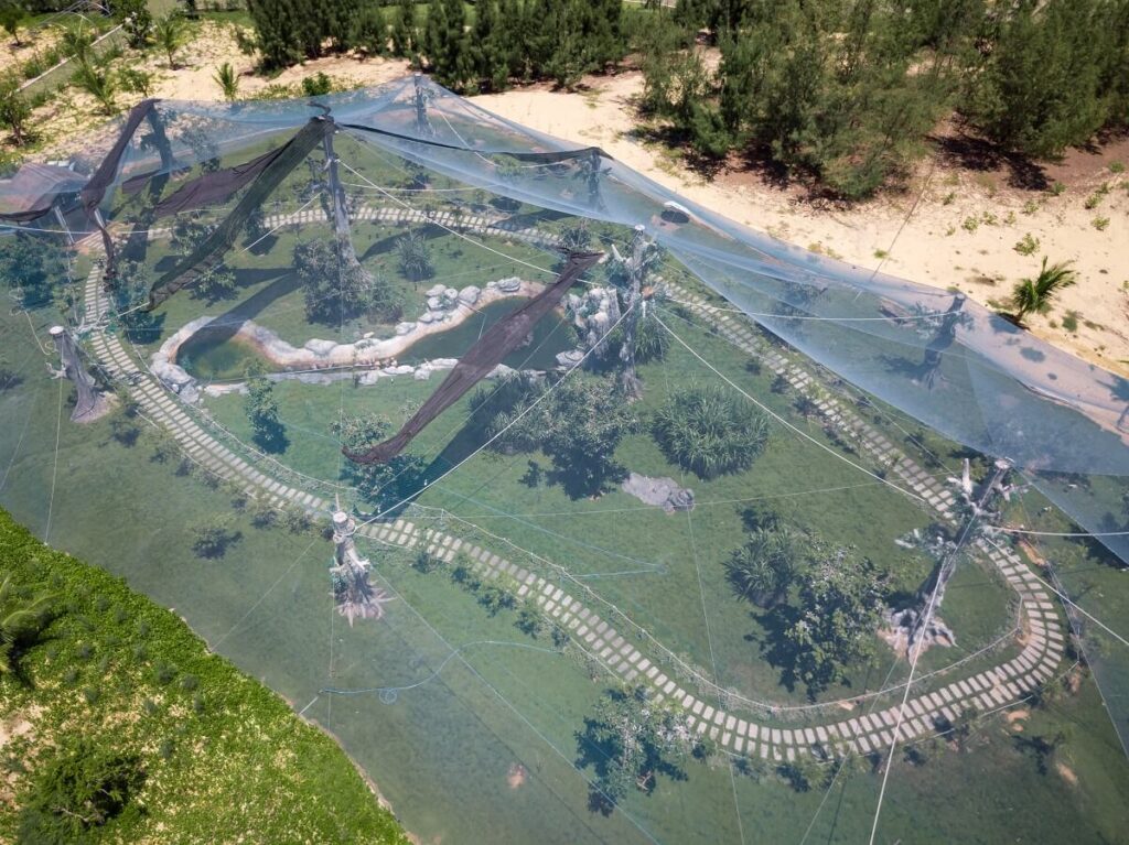 Khu vực vườn chim rộng trên 3000 m2 với hệ thống lưới chuyên dụng được giăng mắc quanh khu vườn thay vì các lồng hẹp, giúp nuôi thả các loài chim trong điều kiện gần gũi với tự nhiên
